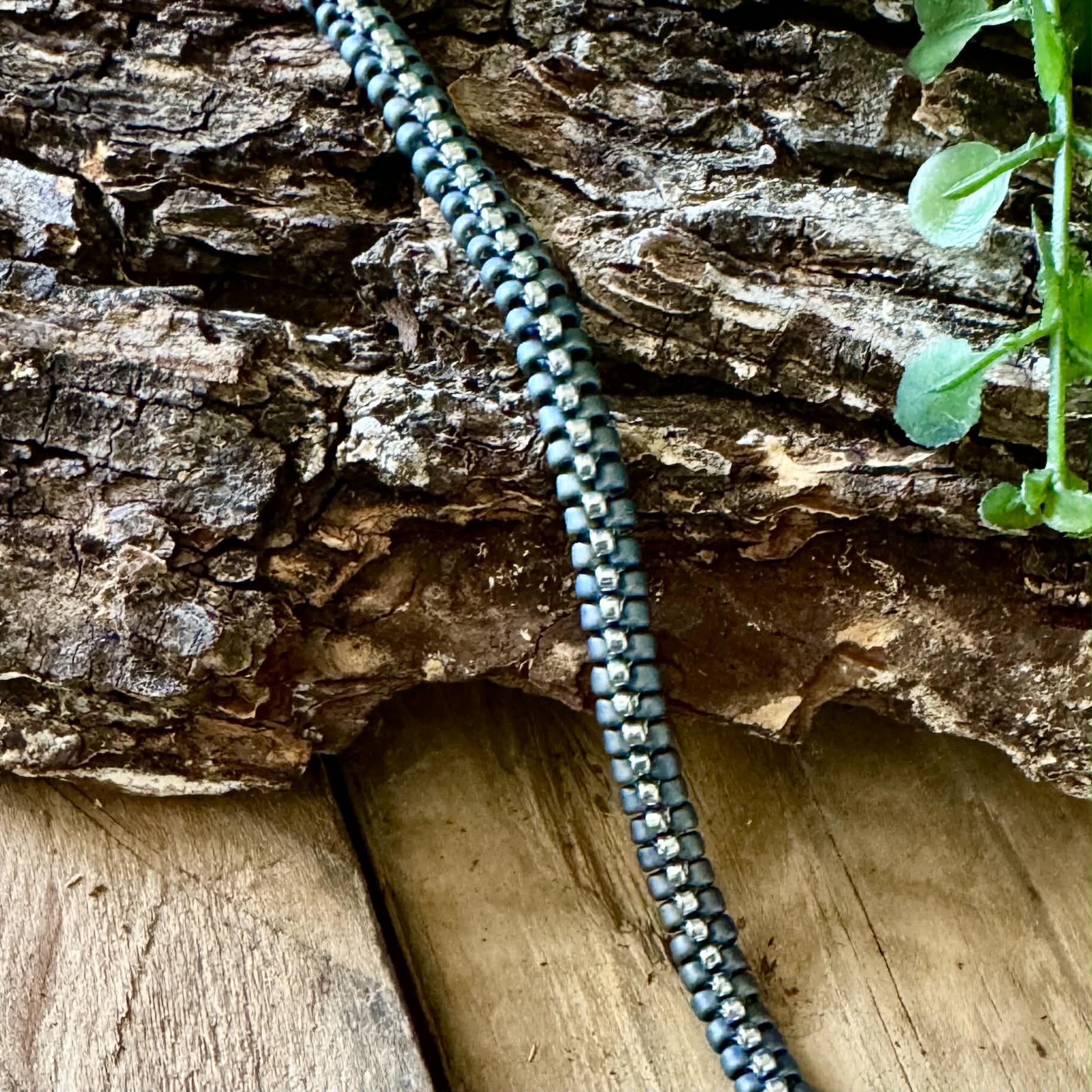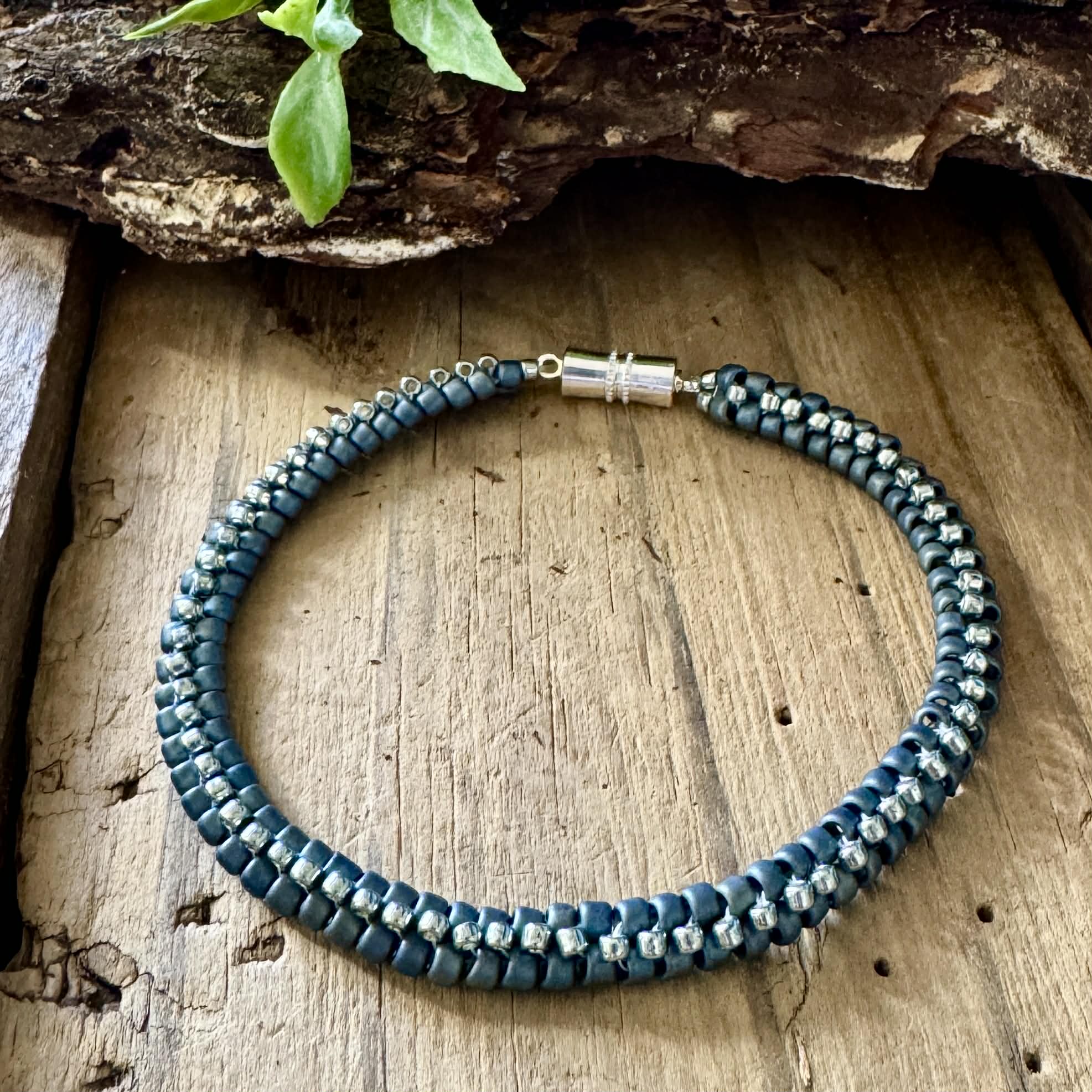 This striking handmade bracelet is crafted with premium 8/0 Toho glass seed beads in a rich, Mediterranean blue with a metallic-finished. The beads are arranged in a cool zipper pattern that mimics interlocking teeth, creating a textured, eye-catching design.
