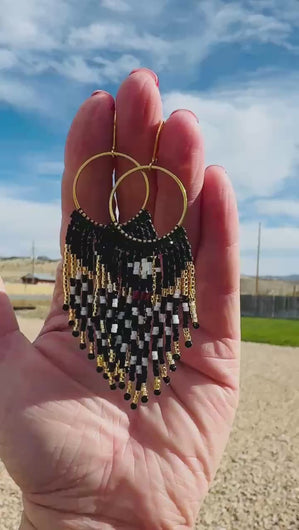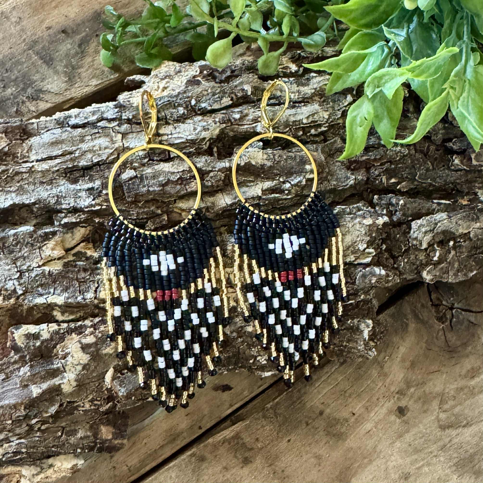 Gold plated hoops have been carefully hand beaded to create a stunning pair of earrings that you can wear with almost anything! The slight contrast between matte and shiny black beads combined with a lustrous white and accents of cranberry red and gold is so beautiful! They catch the the light and have a subtle shimmer without being glittery or sparkly. They are big enough to make a statement, while still being lightweight and easy to wear.